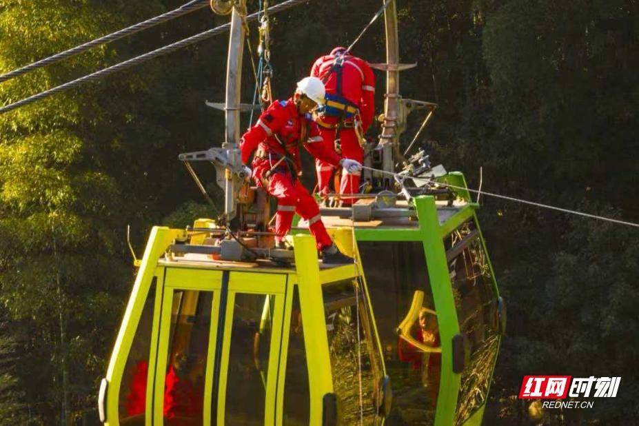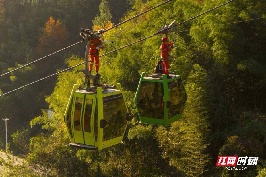 演练现场。孟维 摄本次演练模拟索道突发机械、电气设备故障停机,5个吊厢内游客被困场景,聚焦三项核心救援科目并细化操作流程:在T3-T4自溜车垂直救援中万德策略,杨家界索道空中救援人员廖明月携带60米安全绳救援包万德策略,与支架辅助人员乘吊箱抵达4号支架万德策略,从下行侧乘坐自溜小车滑至1号被困吊厢,完成2名模拟游客施救后,再自溜至3号支架返回地面,地面安抚人员同步做好游客情绪疏导。
