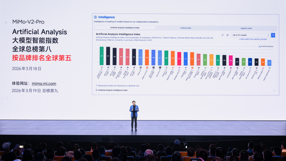雷军同时宣布,小米正式发布三款自研大模型:面向Agent时代的旗舰基座模型Xiaomi MiMo-V2-Pro、全模态大模型Xiaomi MiMo-V2-Omni和语音大模型Xiaomi MiMo-V2-TTS。其中Xiaomi MiMo-V2-Pro在全球权威大模型综合智能排行榜 Artificial Analysis上位列全球总榜第八、按品牌排名全球第五,排名超过xAI的Grok。
