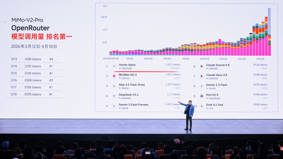 3月19号凌晨,小米对外官宣,Xiaomi MiMo-V2-Pro早期测试版本,正是此前在全球API平台OpenRouter上引发热议的匿名模型“Hunter Alpha”,模型上线后备受全球开发者欢迎,连续拿下多个日榜排名第一,当前位列周榜第一。