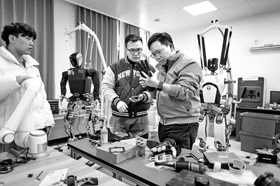研发团队在武汉大学机器人学习算法与软操作实验室对“天问”人形机器人进行研发调试。新华社发