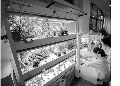 浙江嘉兴市东北师范大学南湖实验教育集团智慧生态实验室内,学生们利用基于物联网的水培系统进行生物的培育实验。新华社发